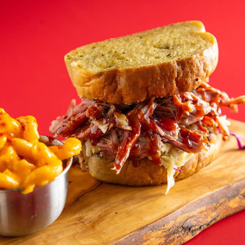 Smoked Brisket, Pulled Pork, or Pork Belly nestled in between two pieces of thick-cut Texas toast, topped with our in-house coleslaw.